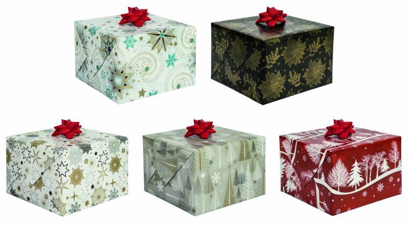 Vánoční balící papír luxusní, mix 5 vánočních motivů, Role 70x200cm.Balení box 50ks, cena za 1 roličku