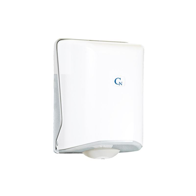 Nástěnný zásobník na papírové ručníky v roli o rozměru : pr. 20x20cm odvíjené středem přes průvlak.