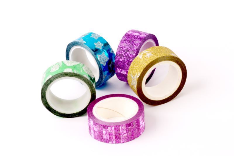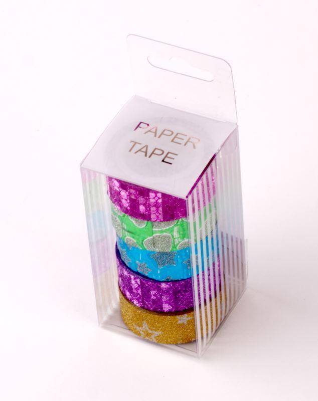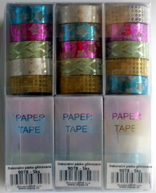 Dekorační lepící páska glitrová, potisk srdce a hvězdy, různé barvy, 5 ks v balení, baleno v blistrové krabičce.