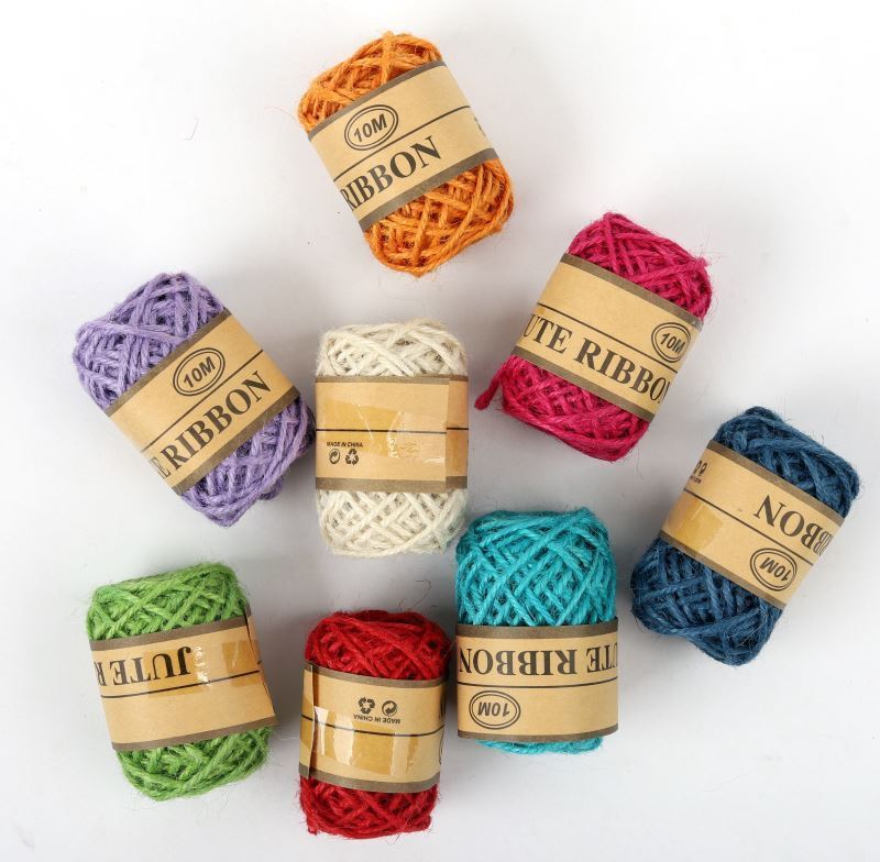 Dekorativní provázek Jutový délka návinu 10m, klubíčko, mix 8 barev - zelená, fialová, bílá, tm. modrá, sv. modrá, červená, oranžová, vínová, balení box 24ks, cena za jedno klubíčko.