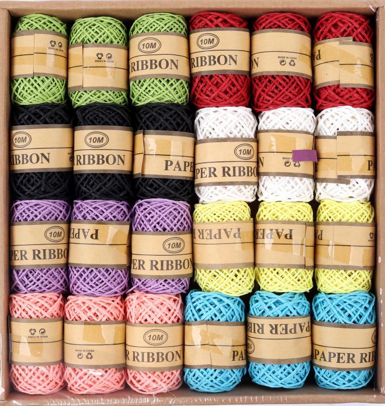 Dekorativní provázek papírový 10m klubíčko mix 8 barev (zelená, červená, černá, bílá, fialová, žlutá, růžová, modrá) balení box 24ks, cena za jedno klubíčko.