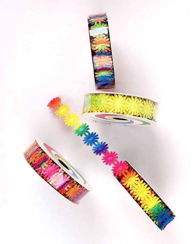 Dekorativní stuha květ šířka 18mm, délka 270cm, balení 36 ks, mix barev, cena za jeden návin. Vhodná pro veselé balení dárků a kreativní tvoření doma i ve škole.