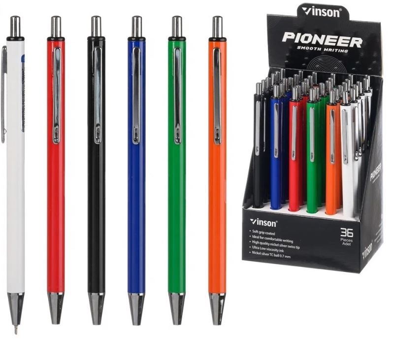 Kovová kuličková psací propiska Vinson, vysoká kvalita, gelové olejové složení náplně (oil gel inks pen) mix 6 barev. Balení 36 ks v papírové krabičce. Cena za 1 ks.