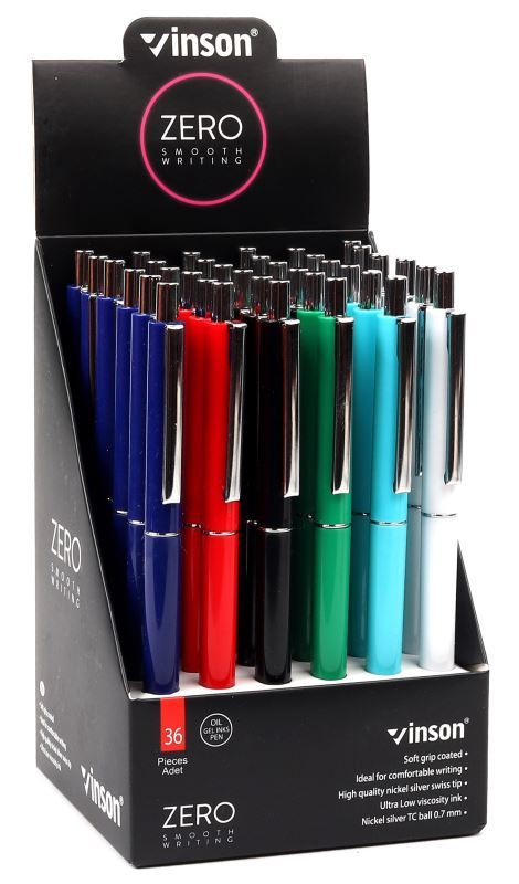 Plastová kuličkové psací propiska Vinson, vysoká kvalita, gelové olejové složení náplně (oil gel inks pen) mix barev. Balení 36 ks v papírové krabičce. Cena za 1 ks.