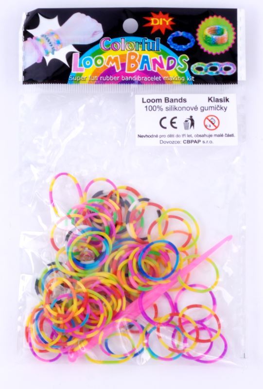 Kvalitní silikonové gumičky ideální pro výrobu náramků, prstýnků, přívěsků a dalších dekorací pomocí stavů nebo háčků. Oblíbená kreativní aktivita u dětí i dospělých. Balení 100ks gumiček + háček a 6ks spojovacích sponek. Nevhodné pro děti do 3 let.