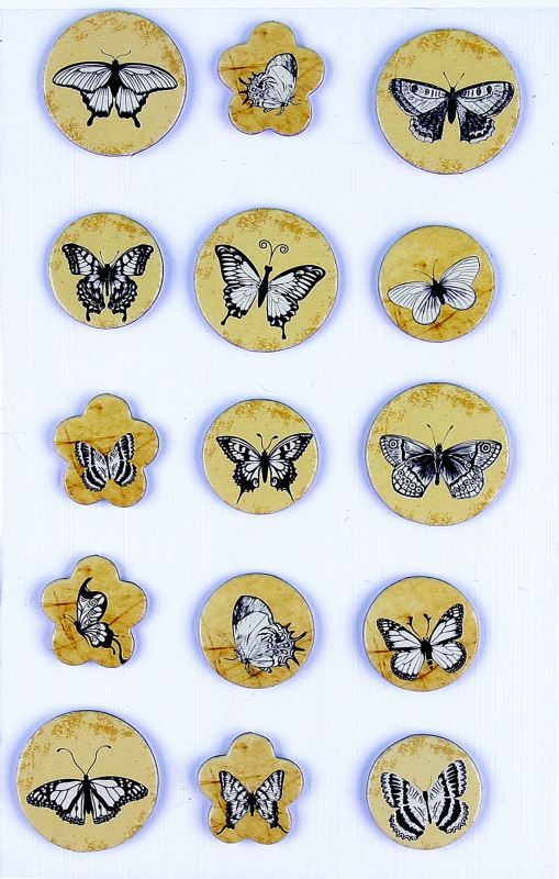Nalepovací dekorace na plastovém kolečku je namalovaný motýl, různé provedené, různé velikosti, na kartě 15kusů, cena za celou jednu kartu.
