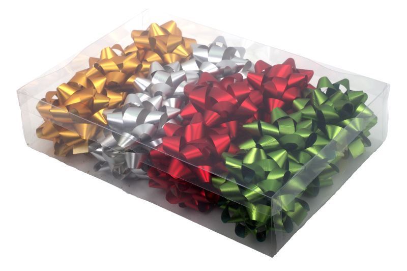 Dárková rozeta matná, samolepící, velikost 9cm, mix 4 barvy, červená, zelená, zlatá, stříbrná. Balení 24ks v průhledném PP boxu, cena za 1 kus.