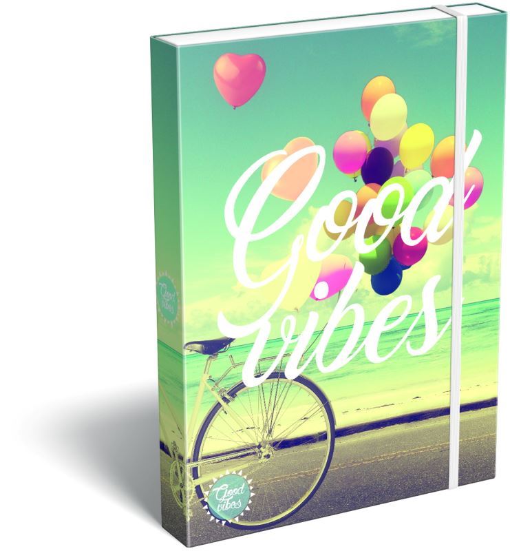 Motiv: Good Vibes Baloon, velikost 330x240x42 mm. Velmi pevný box na školní sešity, k uzavírání slouží barevná gumička, vysoká kvalita, potisk s odleskem.